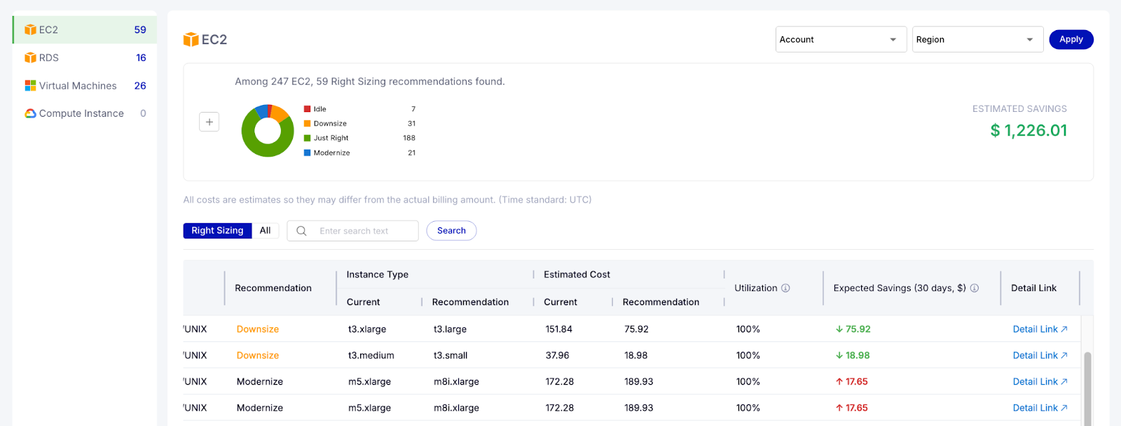 탐지된 데이터를 바탕으로, 시스템은 단순히 '삭제'만을 권고하지 않고 상태에 맞는 최적의 비용 절감 액션 아이템을 제시합니다.